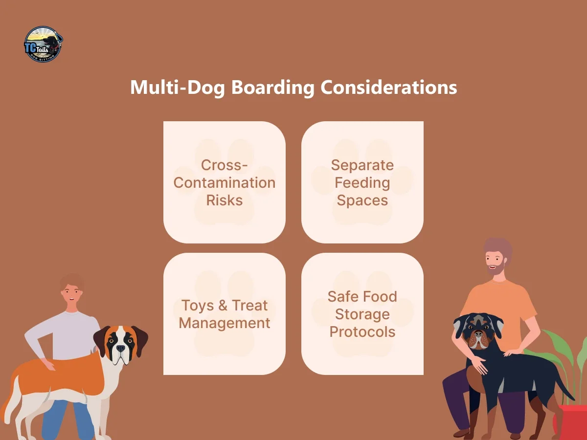 If your dog will be staying where other dogs are present, you need additional precautions. Cross-contamination isn’t just about shared food bowls—it’s also about toys, treats during training, and even residue from another dog’s mouth after they eat.